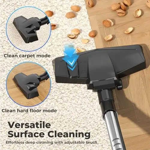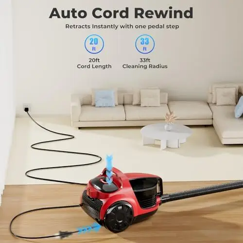 Lightweight, Quiet, and Easy to Use: Engineered for comfort and mobility, this canister vacuum is lightweight and easy to carry from room to room. A 20-foot power cord combined with automatic rewind provides a generous 33-foot cleaning radius. An adjustable suction knob lets you switch between gentle cleaning for drapes and high-power mode for deep carpet cleaning—making whole-house maintenance fast and effortless.