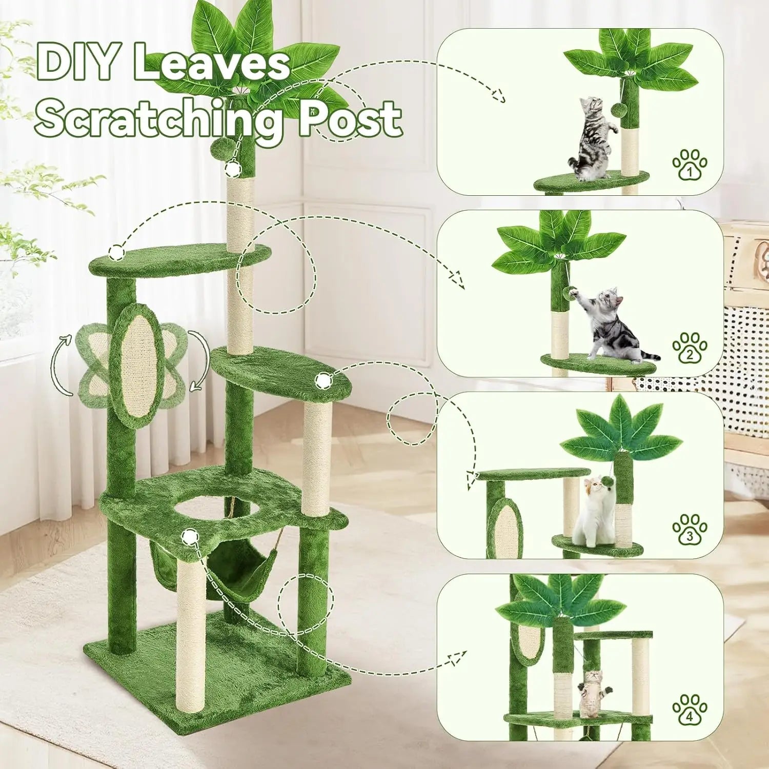 61' Cat Tree for with Green Leaves, Multi-Level Large Cat Tower with Hammock, Plush Cat House with Hang Ball Toy and Sisal