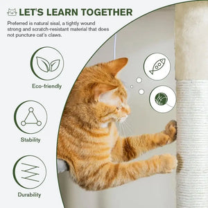 The cat tree features two plush condos for cozy resting spots, three hanging balls for engaging play, sisal rope coiled posts and a scratching ladder to encourage positive scratching behavior, and a multi-layer tower that caters to the climbing nature of kittens. Three padded plush perches offer a comfortable place for your feline friends to rest.
