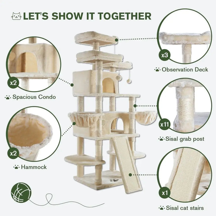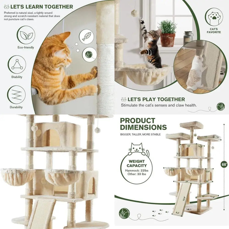 68 Multi-Tiered Large Cat Tower for Big Cats with Condo, Plush Perches, Sisal Posts, Hammocks, and Playhouse - Beige