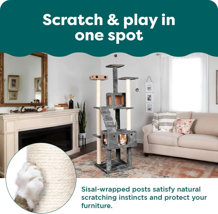 69.3" Tall Cat Scratching Post Tower with 2 Condos, Sisal Cat Tree, Toys & Perches for Indoor Cats