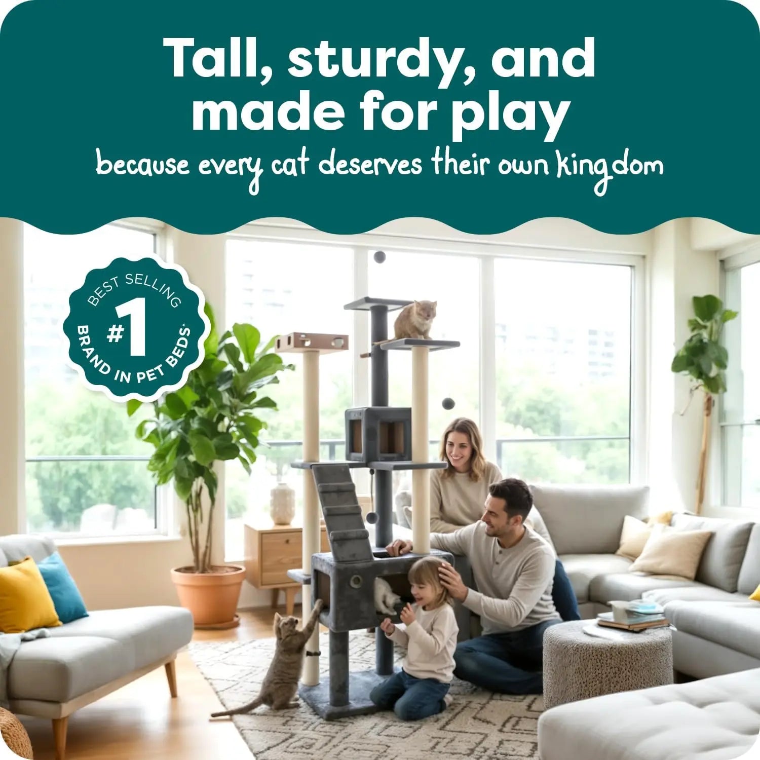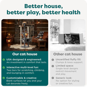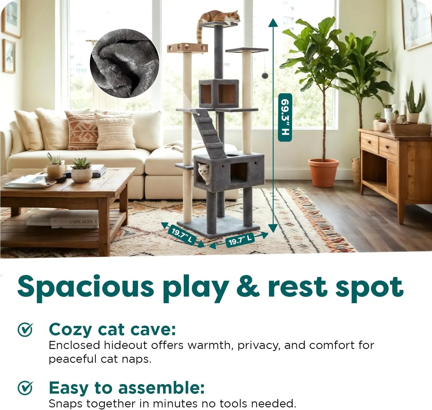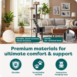 This tall cat scratching post tower is designed to keep your indoor cats active and engaged. With multiple vertical scratching posts and play zones, it promotes natural climbing behaviors, encouraging a healthy and mentally stimulated lifestyle for your feline friend throughout the day. Key Features: - **Keeps Cats Active**: Engineered for true enrichment, this tower supports natural climbing with vertical scratching posts and play areas, helping cats stay entertained and healthy. - **Fits Every Personality**: Crafted to suit different cat habits, it features two enclosed condos for shy cats to hide securely, plus multiple perches and scratch posts for climbers to explore their territory comfortably. Dimensions: 19.7"L x 19.7"W x 69.3"H. - **Easy to Clean**: Fabric-covered surfaces and carpet scratching posts allow for effortless spot-cleaning with a damp cloth. Routine vacuuming removes shed fur and dander, maintaining a hygienic play space without odors. - **Built to Last**: Designed with durability in mind, the posts are wrapped in sisal fiber that mimics tree bark texture to satisfy scratching needs. Made from durable materials like polyester and natural sisal fiber, it provides a safe and long-lasting entertainment experience for both kittens and adult cats. - **Versatile Design**: This double-decker playground includes toys and perches to create an engaging environment, ensuring your cat has plenty of space to play, rest, and scratch. Benefits: - Promotes physical activity and mental stimulation for indoor cats. - Offers secure hideaways and exploration zones tailored to different personalities. - Simplifies maintenance with easy-clean surfaces that resist odors. - Constructed from high-quality materials for stability and longevity as a reliable cat scratcher post.