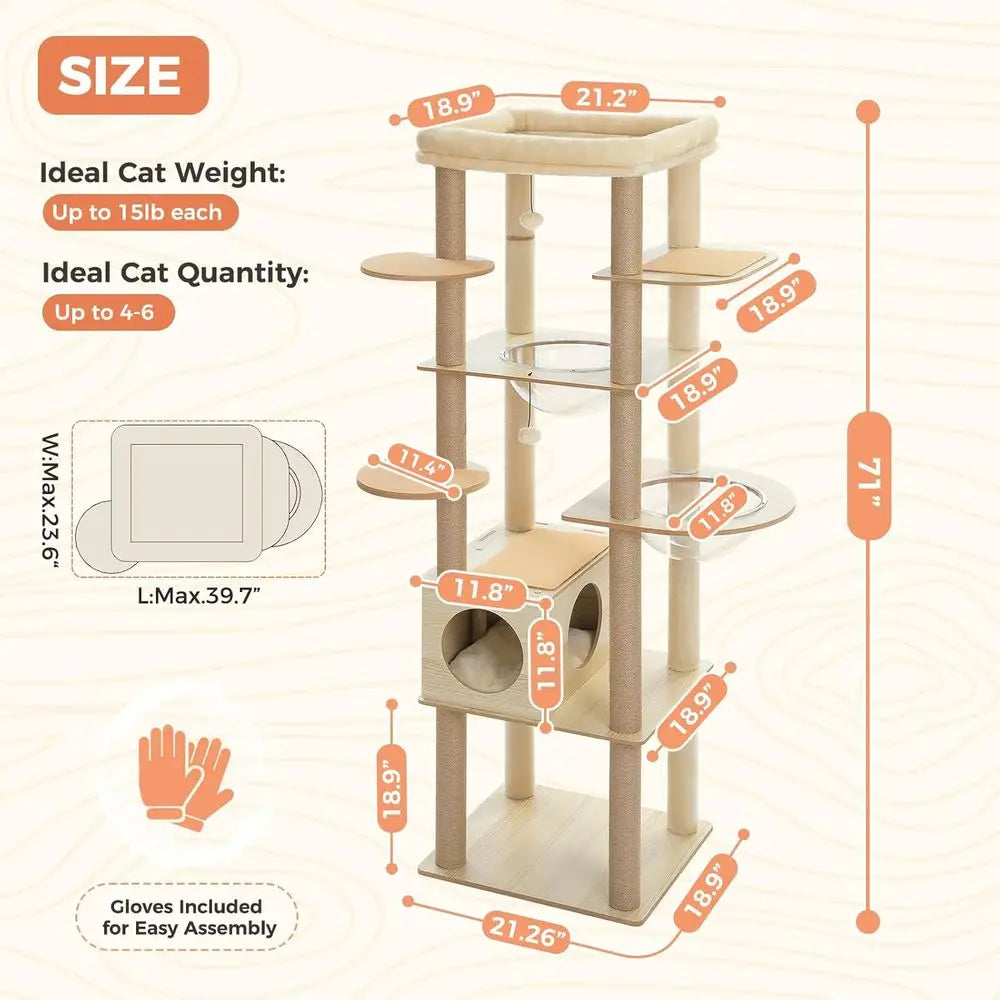 71" Tall Wood Cat Tree for Large Cats, Modern Cat Tower with 2 Acrylic Bowls, Large Top Perch, Spacious Cat Cave (Soft Cushion I