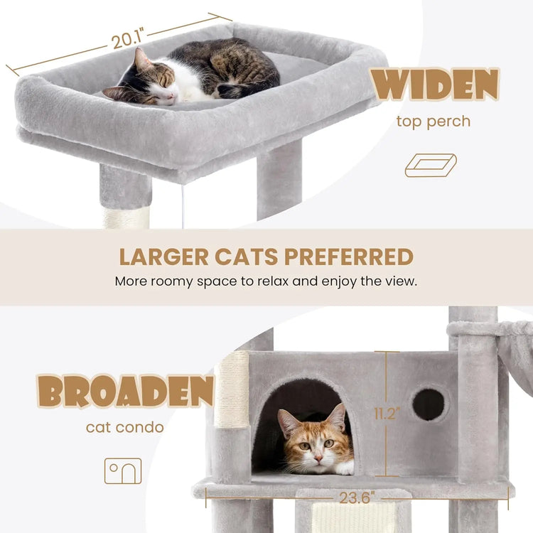 STRUCTURAL UPGRADE: The cat tree now stands 81 inches tall, featuring a wider top perches and larger cat condos, specifically designed to support the activities of larger cats and multi-cat