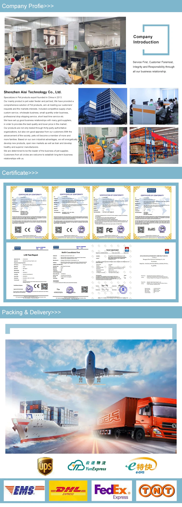 FAQ 1. Are you manufacturer or trade company? ----We are Integrated Industry and trade company,specializes in Pet products export founded in China in 2013. We have provided a comprehensive solution of Pet products, aim at meeting our customers' requests and the markets interests. 2. Can l ask for a sample? ----Yes we provide free sample. Samples cost will be 100% Returned after you place a formal and batch order. 3.How long we can get the samples? How long about the delivery time? ----Our RTS Product sample time is 2-5 working days, delivery time is about 10-20 days. ----Our OEM Product sample time is 7-10 working days, delivery time is about 15-30 days. 4.What kind of shipping method can you cooperate with? ----Sea shipping, railway shipping and air transportation are all available. DHL, UPS, FEDEX, TNT or some special shipping routes are publicly known for shipping,too. We will check the best shipping solution according to the destinations and order quantity for our customers. 5.What payment terms you accept? ----We accept T/T, L/C, PAYPAL. Any kind of payment is OK for us. 6.What about your warranty? ----We offer 12 months of guarantee for all our products since the date of delivery date. For any quality problem, please take photos and videos for our checking. We will held the responsibility and give you a satisfactory solution. Negotiation is a better solution for problems. 7.What services you will provide? ----Custom service: we have set up good business relationships with many gold suppliers,can provide the OEM service to our customer. ----Wholesale business: we sell many kinds of hot selling product in the market, can we can provide the best price with good quality product to our customer. ----Small quantity order business: if you just start doing business in the market, you can contact with us, we support low quantity order with faster delivery time. ----Professional drop shipping service: most of our product support MOQ 1pcs with best price. ----Short lead time service: our product lead time is about 3-5 working days. 8.What is your Company business principle? ----Service First, Customer Foremost, Integrity and Responsibility through all our business relationship.