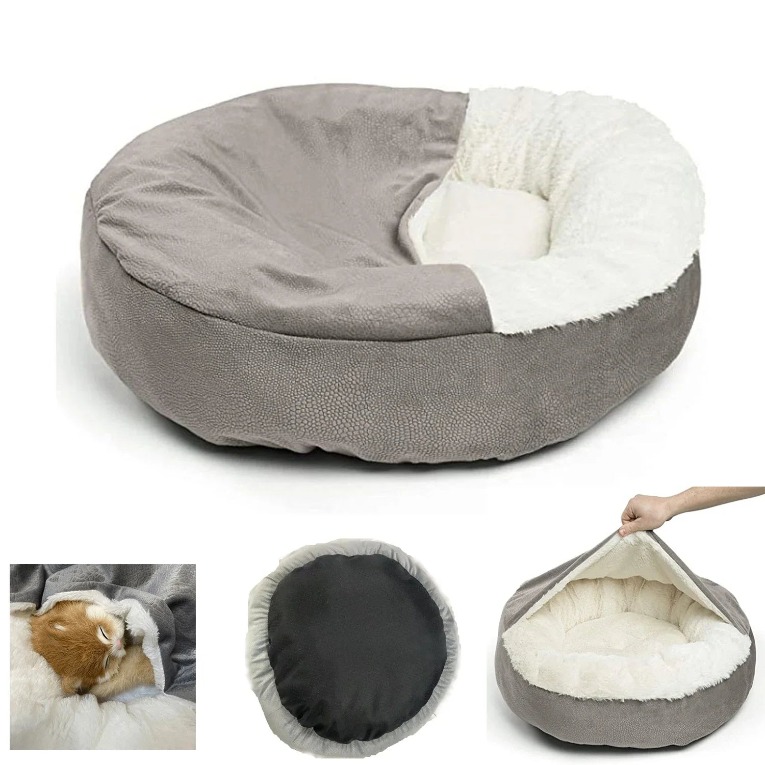 Four Seasons Washable Round Dog Cat Bed with Attached Blanket, Soft Plush Cozy Donut Cuddler, Hooded Pet Beds, puppy/dog beds