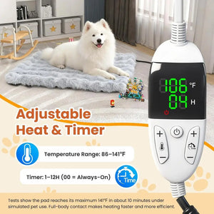 This pet heating pad offers multiple heating levels (86–141℉) and 13 timer settings (1–12H or “00” -on). Tests indicate it reaches the set temperature in about 10 minutes when pets lie on it, providing swift comfort. With overheat protection and UL-certified safety, it’s a truly safe heated pad for pets.