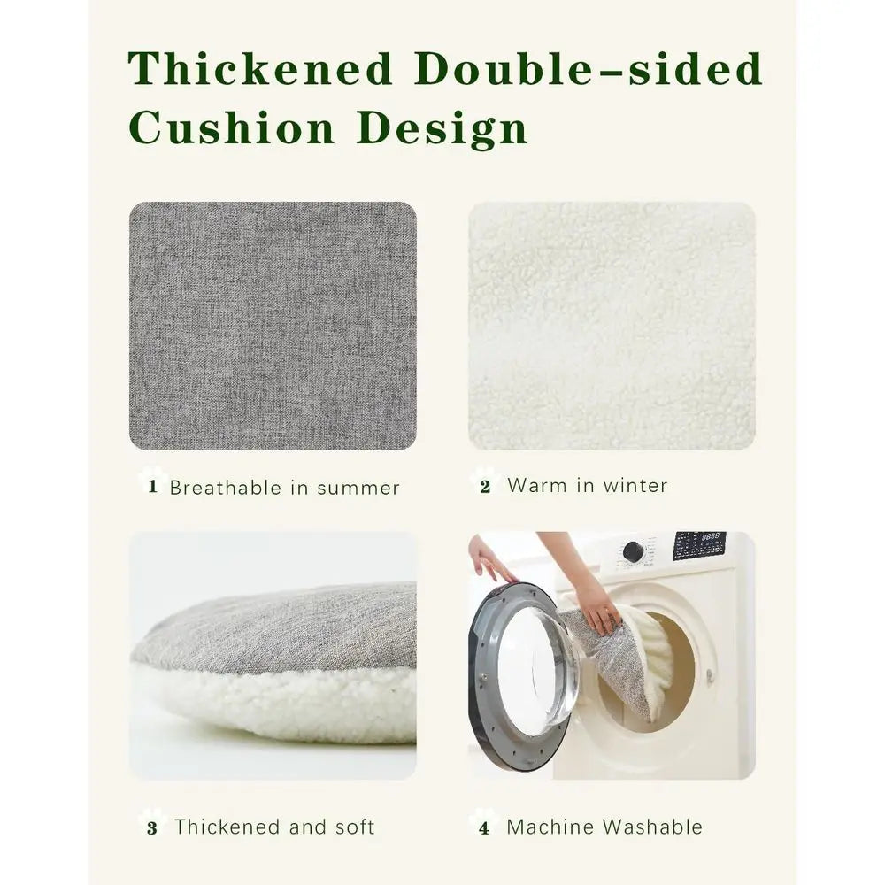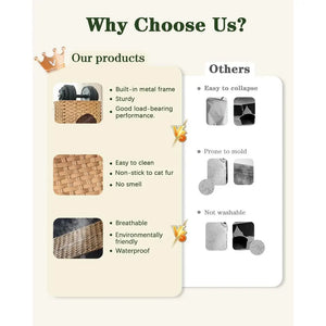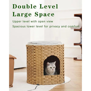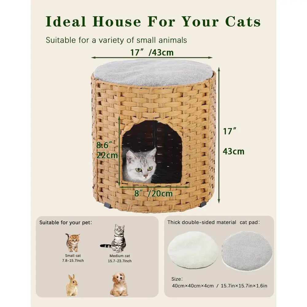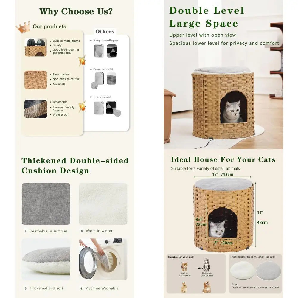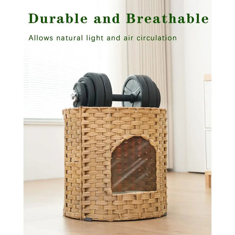 Premium Materials: Handwoven with durable PE rattan, this large cat house provides a soft, shiny, and airy space for cats. The cat cave comes with a double-sided pad that is breathable in summer and soft and warm in winter.