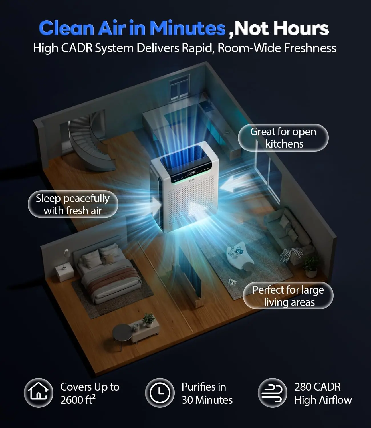 Experience cleaner air in your home with this high-performance air purifier designed for large spaces up to 2600 square feet. Its advanced features ensure efficient purification while providing convenience and peace of mind. **Key Features:** 1. **Powerful Triple Intake System** - Front and dual-side air inlets maximize airflow for faster whole-room purification. The HEPA filter captures 99.97% of airborne particles including pet hair, dander, dust, smoke, and odors. 2. **Real-Time Air Quality Monitoring** - Built-in PM2.5 sensor displays current air quality levels on the clear digital screen. Auto mode automatically adjusts fan speed based on detected pollution for optimal performance. 3. **Washable Pre-Filter Design** - Durable grid-structured plastic frame resists deformation and supports long-term use. Simply rinse or vacuum to clean, extending the life of the main HEPA filter and reducing replacement costs. 4. **Multiple Speed Options & Timer Function** - Choose from four adjustable fan speeds (low, medium, high, turbo) to match your needs. Programmable timer (2/4/6/8 hours) allows operation during sleep or when away from home. 5. **Ultra-Quiet Sleep Mode Operation** - At just 22 decibels with no bright lights, this mode creates a peaceful sleeping environment while maintaining continuous air purification throughout the night. 6. **Convenient Filter Maintenance** - Built-in reminder light alerts when filter replacement is needed. Recommended replacement every 3-6 months ensures consistent performance and fresh indoor air quality. 7. **Energy Efficient Performance** - Smart auto-adjustment technology saves energy when air quality is good while providing powerful purification when pollution levels rise. 8. **Certified Safety & Reliability** - Meets multiple certification standards for electrical safety and environmental protection. Backed by comprehensive customer support including warranty coverage and technical assistance. This versatile air purifier effectively addresses common indoor air concerns including pet allergens, cooking odors, smoke particles, and general dust accumulation. The washable filter design offers long-term value by reducing ongoing maintenance expenses while the quiet operation makes it suitable for bedrooms, living rooms, offices or any space where clean air matters.