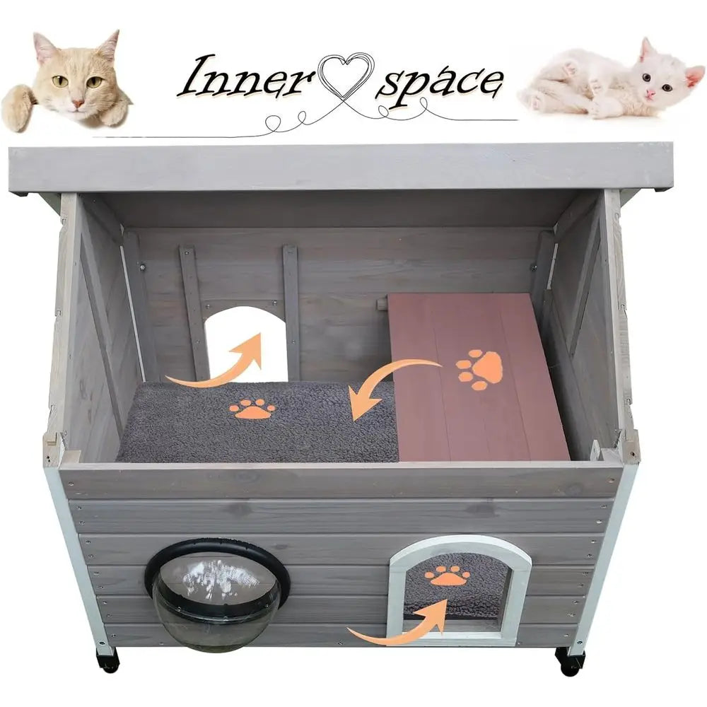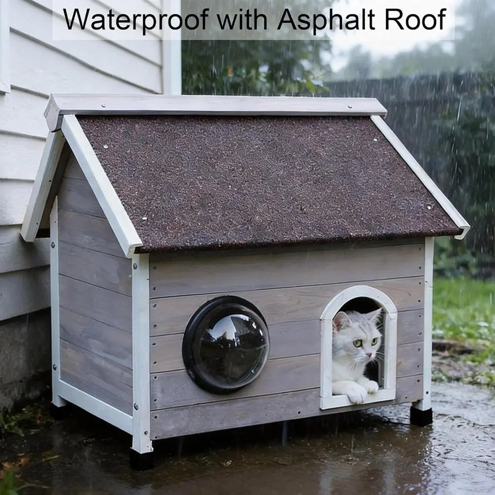 Weatherproof Outdoor Cat House with Insulated Door and Clear Windows for Two Cats, Includes Self-Warming Mat