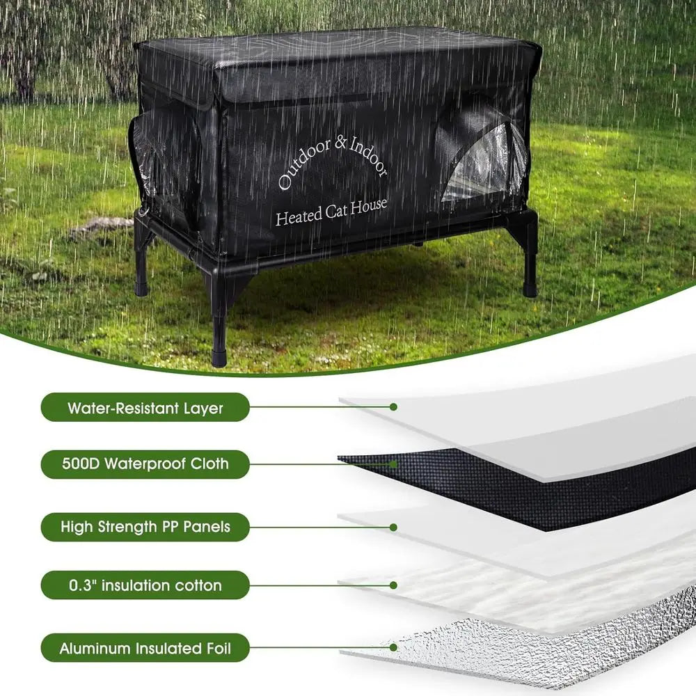 Insulation and Heat Circulation: This heated outdoor cat house is crafted to provide warmth for every cat. The exterior is covered with a 500d waterproof tarpaulin that prevents rain and moisture from penetrating. It features pearl cotton padding for the inner walls and has been treated on all six sides to promote heat circulation, preventing heat loss and enhancing insulation.