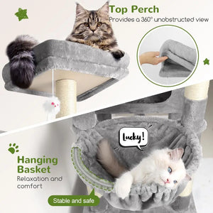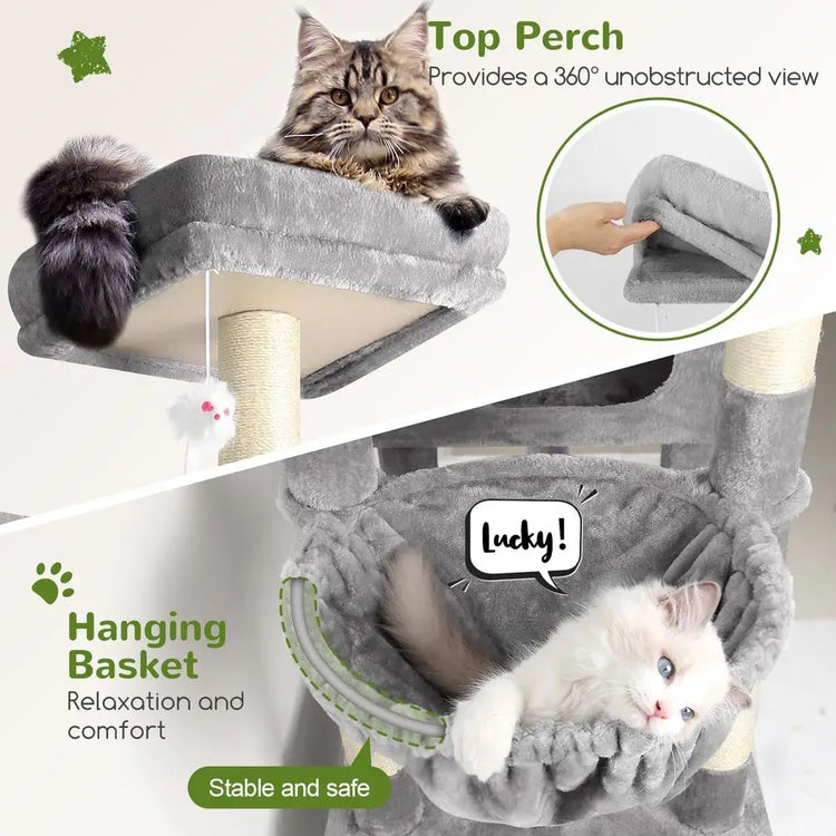 This indoor cat tower stands at an impressive 81 inches tall and offers a multi-level design, perfect for cats to leap between various levels, exercise, and maintain an active lifestyle. It includes two platforms, three cat condos, and one hanging basket, catering to the play needs of large adult cats up to 20lbs.