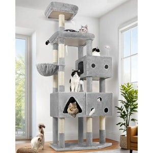 The F81 cat tree is built to accommodate 5-6 cats simultaneously, providing individual spaces for each and minimizing territorial conflicts. The cat condos are uniquely designed, offering secure hiding spots while stimulating play and curiosity. Each condo features distinct openings and shapes, enhancing the fun of playtime.